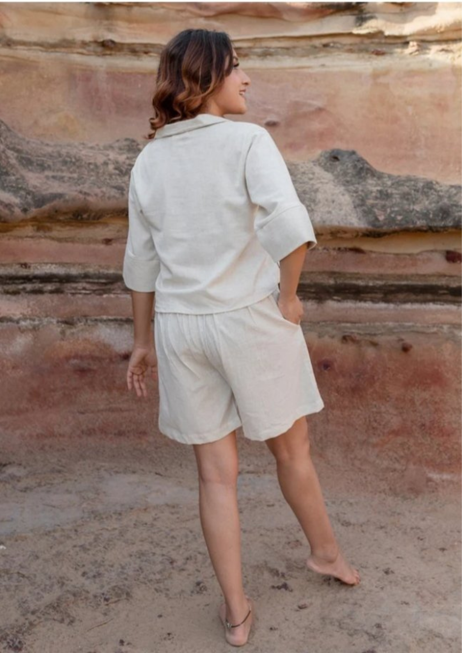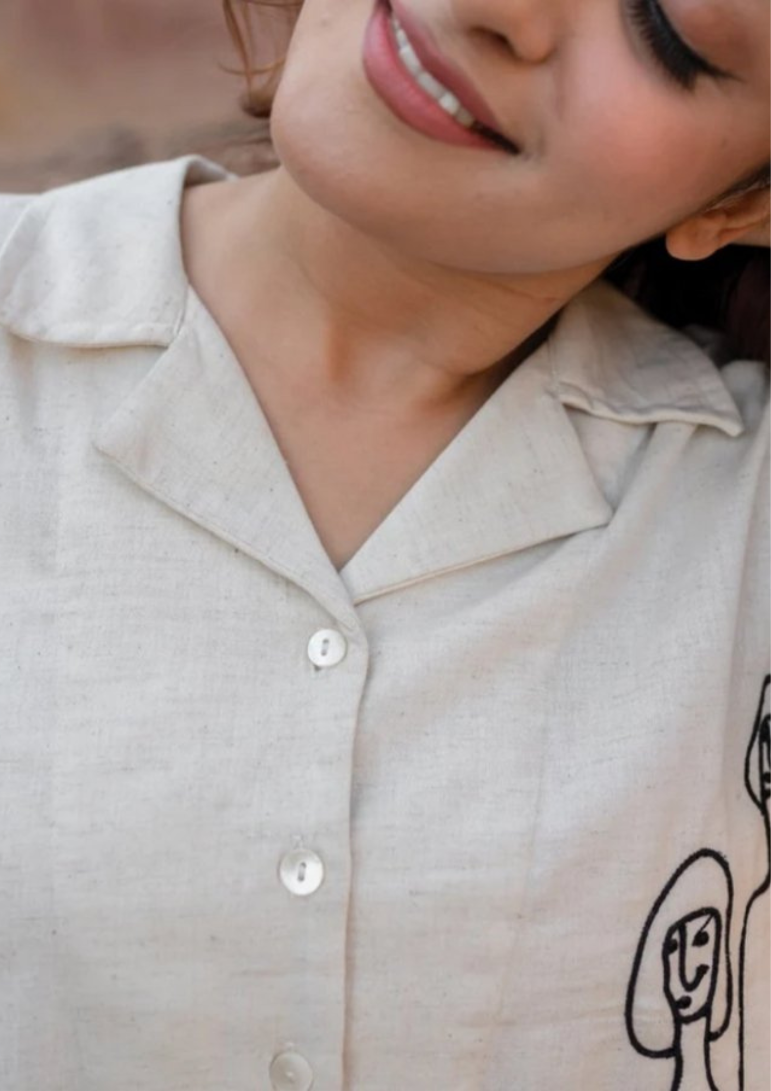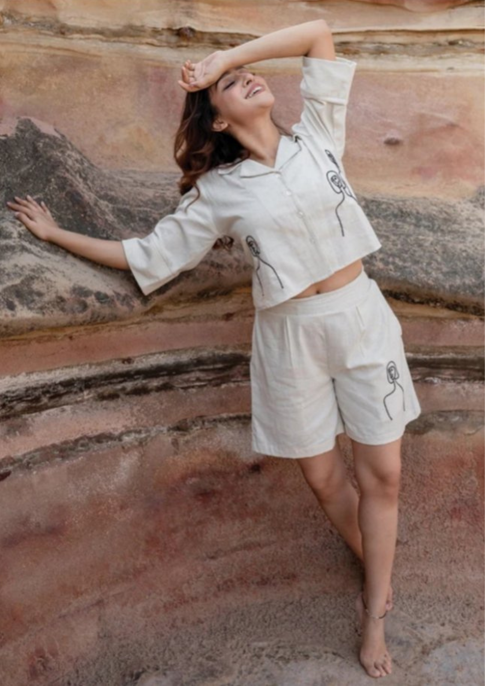 Enhanced with minimal black line-art “doll face” prints on both top and shorts for a bold yet minimal statement